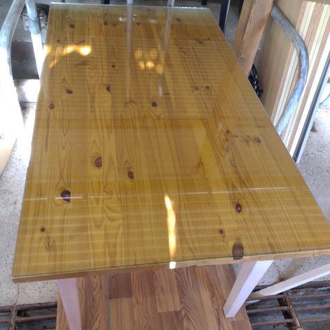 Metallijalkainen jatkettava keittiönpöytä lasikannella.
