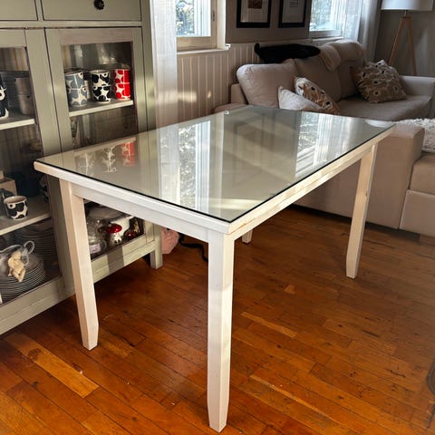 Jatkettava valkoinen ruokapöytä lasikannella