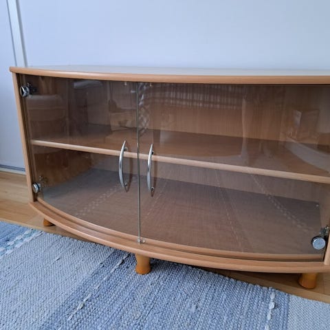 Valkea tv taso /senkki kaapisto lasihyllyillä