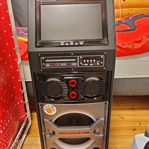 Täydellinen karaokejärjestelmä televisioon. Testasin laitteen ja se käynnistyi niin kuin pitikin. Näytöllä näkyi kuva ja valikot, ja mikrofonin painikkeilla pystyi navigoimaan. En ole varma, miten tätä käytetään, eikä käyttöohjetta ole mukana.