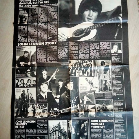 Suosikki lehden jättilakana, vuodelta 1964(arvaus). Katri Helena Eino Grön Markus Allan Antti Einiö ja Taisto Tammi. Ja kuvan toisella puolella the Beatles story. Kuvan koko 4x4 . Nouto Helsingin pihlajamäestä tai posti tuo