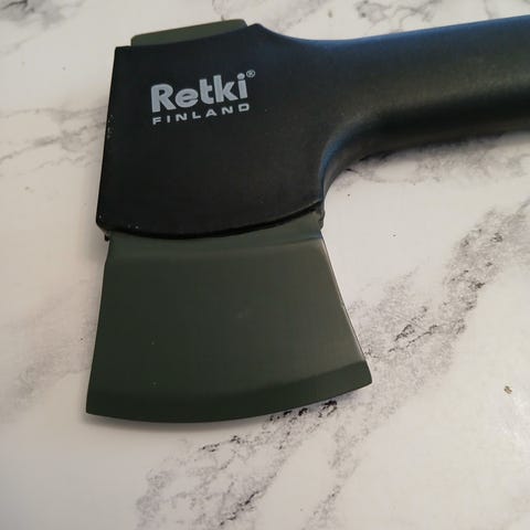 Kirves retkille /klapi hommiin, terä käsintaottu ruotsalainen UF leimalla, valmistaja urafors bruk. Uusi varsi koivua. Teräsuoja parkkinahkaa.