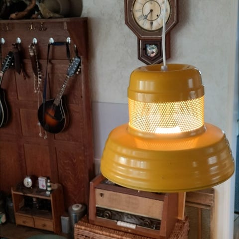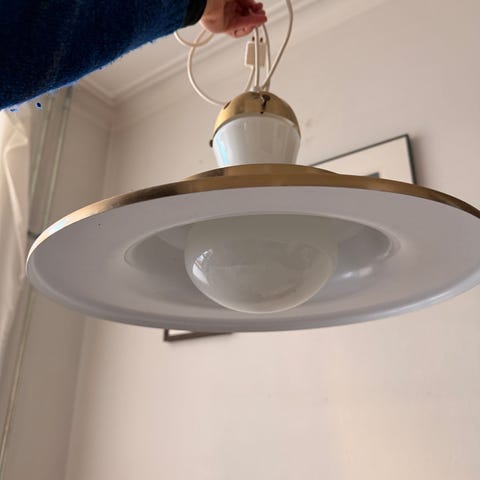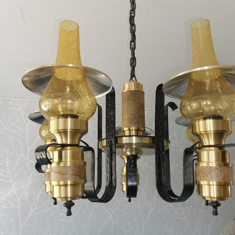 Näyttävä 60-70-luvun Ker-lux valaisin. Päältä lasia, alta keltainen ja ulkoa hopea. Korkeutta voi säätää ketjusta. Liitäntä sokeripalalla.