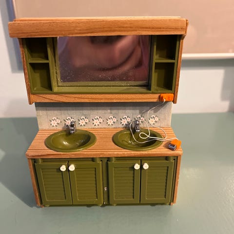 Lundby nukkekoti keittiön laatikosto 70-luvulta. Sokkeli puuttuu ja pöydän kansi likainen eli tuunaukseen.