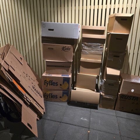 Liedossa Pettisissä iso määrä noin 15-20 kpl s ryhmän kahvallisia pahvilaatikoita