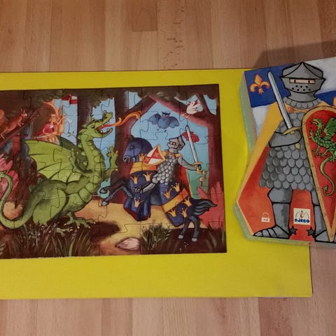Djeco palapelit lapsille. Kuvioaiheina merirosvoteema ja ritari lohikäärmeineen. Palapelit on pakattu hahmon muotoisiin laatikoihin, joissa on värikäs kuvitus. Sopii noin 4+ vuotiaille. Kaikki palat tallessa ja palat hyvässä kunnossa ja paksut/jämäkät. Laatikot hieman haalistuneet.