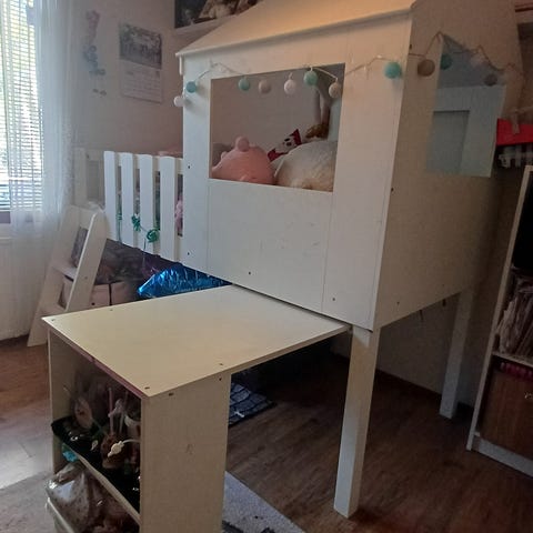 Puinen valkoinen juniorisänky, jossa korotettu runko ja turvakaiteet sivuilla. Sängyssä on puiset sälepohjat ja etuosassa irrotettavat tikkaat. Sopii lapselle, joka siirtyy pinnasängystä isompaan sänkyyn. Sängyn alle jää tilaa säilytykselle tai leikkitilaksi. Patjan saa mukaan halutessaan.