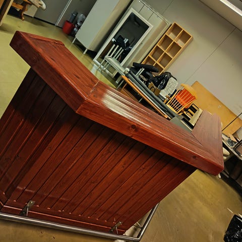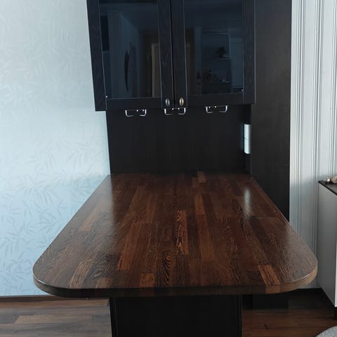 Baaritiski, myymälätiski, autotallin työtaso. Pituus 207,5cm, Kokonaiskorkeus 111cm ja alatason korkeus 78,5cm kokonais syvyys 82,5cm. On tosi painava niin vaatii muutaman riskin miehen kantamaan (saa suoraan tallista peräkärryyn tai isompaan autoon). Lakatut puutasot n. 40mm paksut (hieno puukiviointi alla). Ei toimitusta painon ja mittojen takia, ainostaan nouto Oulusta. En varaile, nopein hakija vie.
