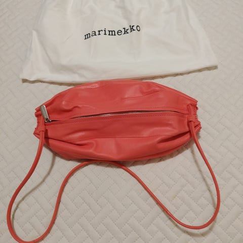Marimekko nahkainen olkalaukku naisille. Laukku on mustaa nahkaa ja muodoltaan kompakti, neliömäinen malli. Laukussa on vetoketjusuljenta ja irrotettava, säädettävä olkahihna.