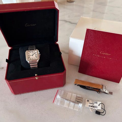 Etsinnässä vintage- Cartier. Mahdollisesti kuvan kaltainen Tank tai Santos. Ei ihan kaikkein pienimpiä kokoja, mutta unisex-klassikotkin voivat silti sopia. Ranne noin 18,5-19cm. Tarjoa rohkeasti