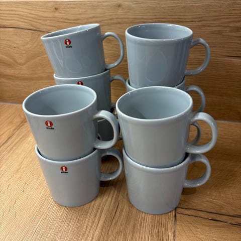 Iittalan harmaat Teema -kahvimukit. Iittalan tarrat irronneet. Olleet jonkin verran käytössä, ei merkittäviä kulumia tai käytön jälkiä.