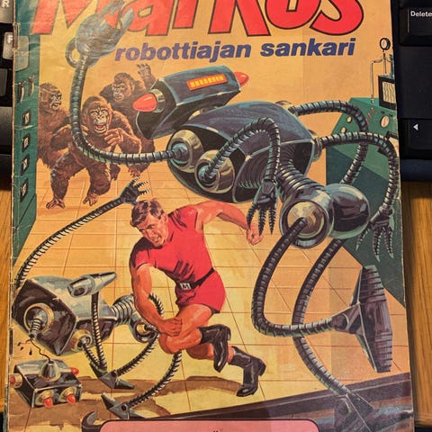 Markos robottiajan sankari sarjakuvalehti. Tieteisseikkailuaiheinen sarjakuvalehti, jossa kannessa avaruusteemainen kuvitus. Painettu paperille, koko noin perinteisen sarjakuvalehden kokoluokkaa. Soveltuu sarjakuvien ja tieteisfiktion keräilijälle tai lukijalle, jota kiinnostavat klassiset seikkailusarjakuvat.