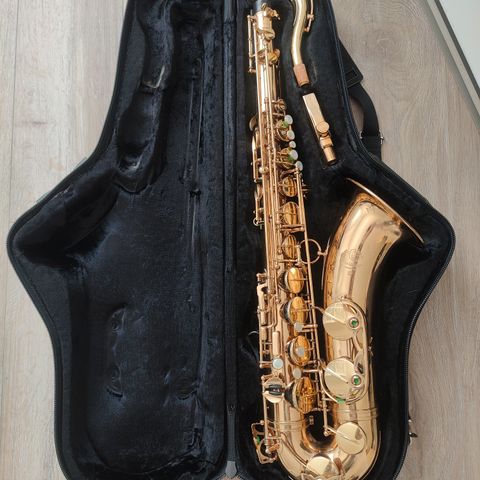 Buffet Crampon Paris tenorisaksofoni. Runko on messinkiä ja lakattu kiiltäväksi. Soittimessa on kaiverruksia kellossa ja perinteinen näppäinasettelu. Mukana kuvissa näkyvä kova sekä pehmeäkotelo ja suukappale sekä kaikki tarvikkeet kuuluvat hintaan. Soveltuu esimerkiksi bändi‑, orkesteri‑ ja harrastekäyttöön tenorisaksofonina. On ollut entisen ammattimuusikon käytössä.