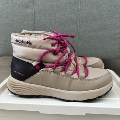 Columbia talvikengät, koko 40. Korkeavartiset, mustat nauhalliset kengät, joissa on vahva kumipohja ja karkea kuviointi talvikäyttöön. Päällinen on synteettistä materiaalia ja tekstiiliä, varressa pehmustetut reunat. Sopivat talvikeleihin ja ulkoiluun kylmissä olosuhteissa. Vedenkestävät. Sisämitta on noin 25,5 cm. Ollut vain vähässä käytössä.