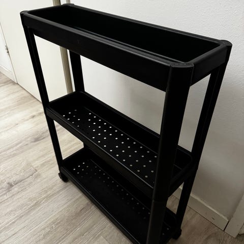 Rullattava säilytyskärry, jossa kolme irrotettavaa valkoista muovikoria metallisessa rungossa. Kärryssä on pyörät, joiden ansiosta sitä on helppo siirtää. Ollut mulla käytössä kauneudenhoitotuotteiden kanssa, nyt kun on pienempi kylppäri niin etsii uutta kotia. Kaksi pientä kosmeettista haittaa ylimmässä rungossa.