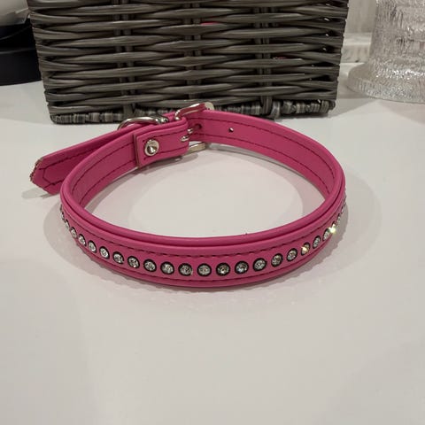 Valkoinen koiran kaulapanta, jossa koristeena useita pyöreitä, kirkkaanvärisiä strasseja. Panta on säädettävä useilla rei’illä ja siinä on leveämpi keskiosa, johon koristekivet on kiinnitetty. Sopii pienelle tai keskikokoiselle koiralle, tarkka koko selviää mittaamalla pannan pituus ja säätövara. Pannan pituus 30cm.