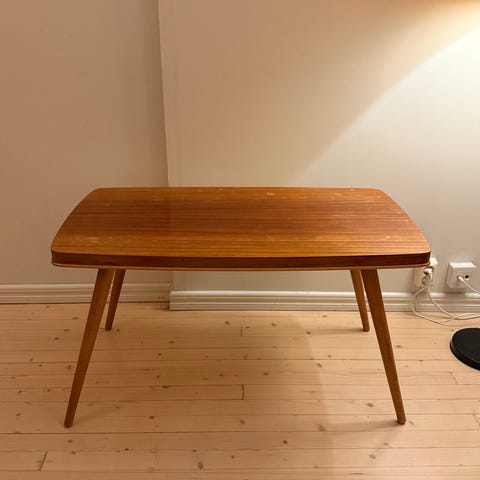 Tukeva massiivikoivusta valmistettu sohvapöytä 50-luvulta. Äskettäin täysin kunnostettu, hiottu kauttaaltaan, pöydän pinta lakattu, runko maalattu hivenen lämpimän harmaaseen sävytetyllä valkoisella kalustemaalilla, huopatassut uusittu. Pinnassa luontaista patinaa ja rungossa pieniä epätasaisuuksia, mutta yleisvaikutelma erittäin siisti.