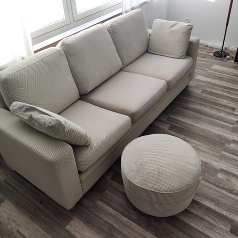 Myydään hyväkuntoinen kangassohva ja samasta kankaasta tehty iso rahi. Erittäin hyvä istua, ei liian pehmeä. Irtotyynyt sisältyvät sohvan hintaan. Sohva erikseen ostettuna 80€ ja rahi 40€, yhdessä ostettuna 100€.