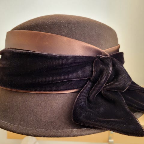 Myydään hurmaava kahvinruskea vintage huopahattu, jossa tekokarvareunus.