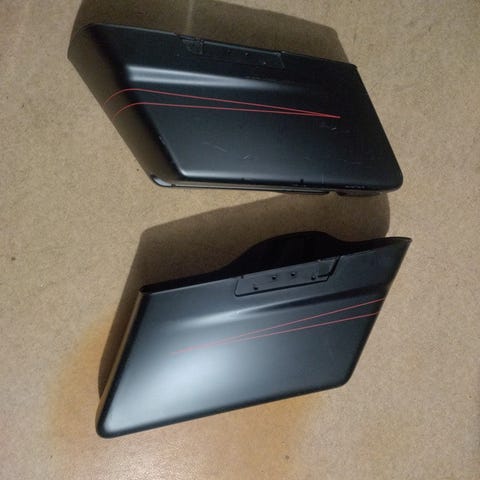 Kuvien mukaiset sivulaukut rautoineen Harley-Davidson clubstyle, FXR yms. Villain2Hero valmisteet, Laadukkaat Lukittavat lasikuituiset.