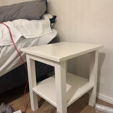 Valkoinen, rottinkinen yöpöytä. Pöytätason korkeus 47 cm + kaariosa 23 cm. Pinnassa vähän maalin kulumaa.