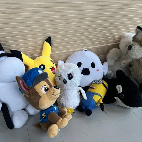 Kasa pehmoleluja. Ehjiä. Pesu jää seuraavalle.