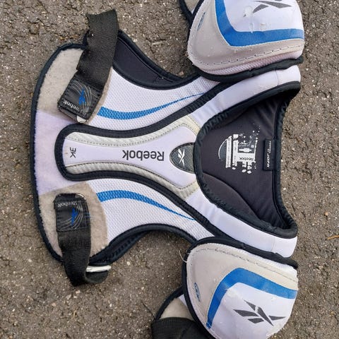 Hyväkuntoinen, siisti lasten Reebok hartiasuoja Koko YT Medium. Rinnanympärys 58-64cm, lapsen pituus suositus 104-122cm. Väri musta valkoisilla yksityiskohdilla. Suunniteltu jääkiekkoon ylävartalon ja olkapäiden suojaamiseen. Pehmustettu rakenne edessä ja takana, erilliset olkasuojat sekä säädettävät kiinnityshihnat olkavarsissa sekä rinnan ympärillä. Käytetty vain joitain kertoja ulkojäillä.