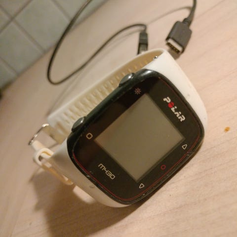 Käyttämätön juoksutietokone käyttöohjeineen.Kellossa suojamuovi näytön päällä.