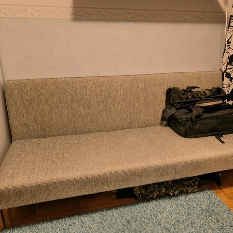Vuodesohva on hyvää kotimaista nahkaa, istuinosassa kahdessa kohtaa repeämä. Istuinkorkeus 42 cm. On painava. Omat kantajat mukaan.