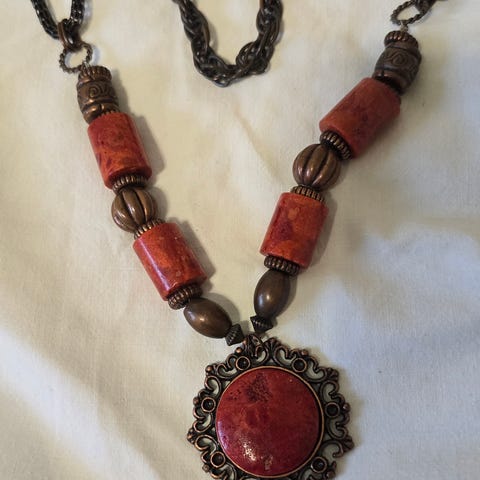 Myydään silmiinpistävä vintage-kaulakoru, joka huokuu 70-luvun egyptiläistä herätystyyliä (Egyptian Revival) ja boheemia tunnelmaa.