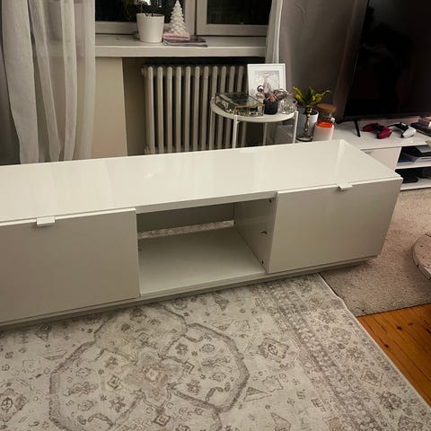 Siisti korkeakiiltoinen tv-taso. Kannessa pieni jälki, joka näkyy läheltä katsoessa.