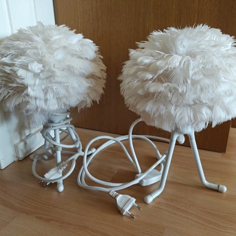 Umage Eos valkoinen höyhenvalaisin. Halkaisija 40 cm. Alapuolella huomasin yhdessä höyhenessä pari tummempaa kohtaa, niistä kuva. Eivät näy käytössä.