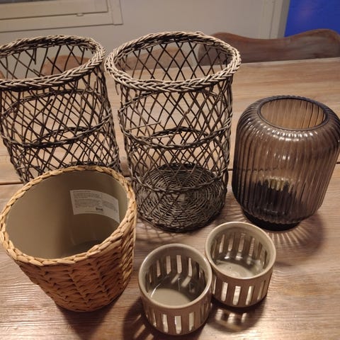 Koristekokonaisuus, johon kuuluu rottinkia tai vastaavaa luonnonmateriaalia oleva n. 42-43cm korkea ruskea maljakko, kuusi pyöreää pöytätablettia halk. n. 37-38cm sekä nippu kuivattuja oksia. Pyöreät tabletit ovat punottua luonnonmateriaalia ja sopivat esimerkiksi ruokapöydän kattaukseen tai muuhun sisustuskäyttöön. Kuivatut oksat voidaan asettaa maljakkoon tai käyttää muuna sisustuselementtinä. Väri kokonaisuudessa on luonnollinen ruskea, joka sopii monenlaiseen sisustukseen. Myydään settinä 20€.