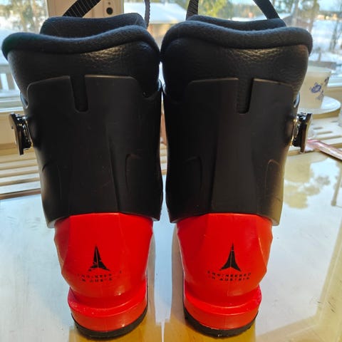 Atomic laskettelumonot punainen musta. Nelisolkinen kuori, säädettävät soljet ja tarrakiristys varressa. Kova ulkokuori ja pehmustettu sisäkenkä tukevat jalkaa rinnelaskussa. Soveltuvat lasketteluun rinteissä.