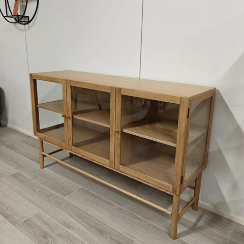 Upea Elba-vitriini on tyylikäs ja käytännöllinen sisustuselementti, joka on varustettu lasiovilla, sivulasiseinillä ja korkeilla jaloilla, jotka yhdessä luovat ilmavan tunnelman. Karkaistu lasi tammikehyksillä tuo hienostuneen elementin säilytysratkaisuun, jossa on kauniisti kolmen lasiseinän läpi kuultavaa hyllytilaa koriste-esineiden ja astiastojen säilytystä varten.