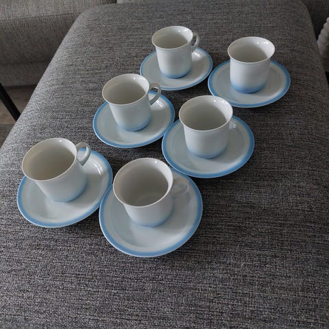 4 tee kuppia ja lautaset. Kuppeja 5., mutta yhdessä reunassa särö. Lautasia 8, mutta ylimääräiset saa vaikka kukkaa alusiksi.
