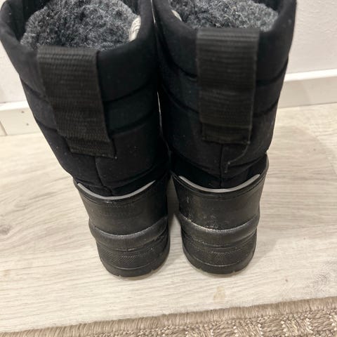 Kuoma lasten talvikengät, koko 30. Väri musta. Kengissä on paksu kumipohja, jossa karkea kuviointi liukkaalla alustalla liikkumiseen. Päällinen on tekstiiliä ja alaosa kumia. Sisäpuolella on harmaa, karvavuori. Niissä on korkea varsi ja takana lenkit helpottamassa pukemista.