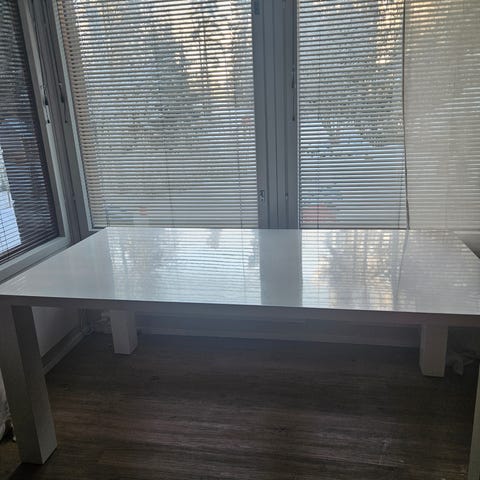 Annetaan elämää nähnyt ruokapöytä. Ostettu aikoinaan käytettynä ja ollut meillä jo vuosia. Paljon käytönjälkiä pöytälevyssä, saa toki pöytäliinalla piiloon.