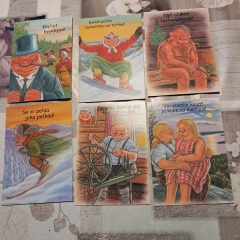Nämä humoristiset Terho Peltomäen piirtämät Hörölä-kortit ovat kaikki kulkemattomia. Näiden hinta on 1 euroa kappaleelta. Postimaksu kirjeessä on 2,75 euroa 50 grammaan saakka. Sen jälkeen maksu on 5,50 euroa.
