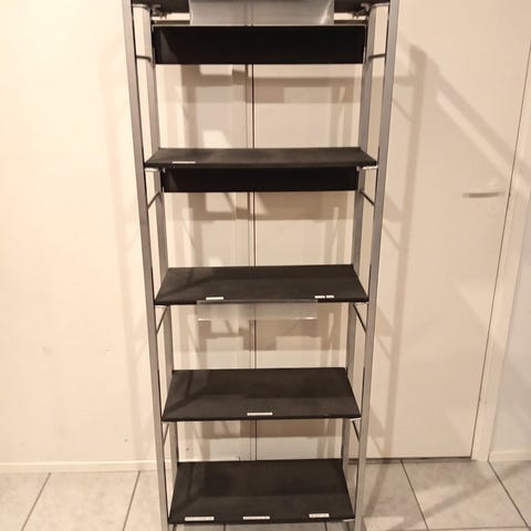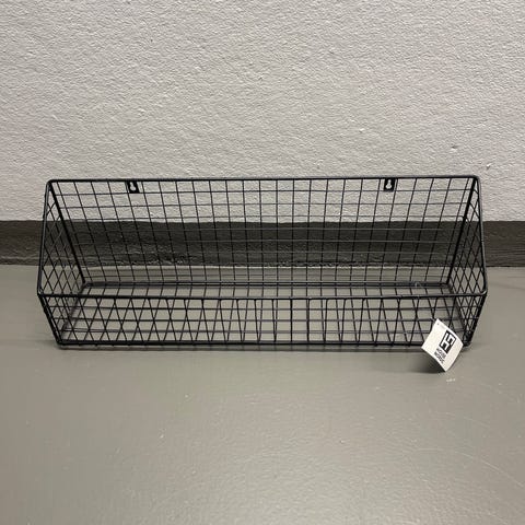 Valkoinen seinähyllylevy, jossa on etureunassa matala metallinen tai metallimainen lista. Hyllylevyssä on valmiit kiinnitysreiät kulmissa seinään kiinnittämistä varten. Sopii esimerkiksi eteiseen, olohuoneeseen tai työhuoneeseen pienten tavaroiden säilytykseen tai esillepanoon.