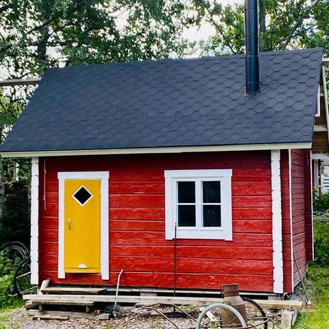 Koukkulavakiskoilla melkein valmis kevythirsisauna. Hormi valmius,uusi peltikatto, pieni pukuhuone.