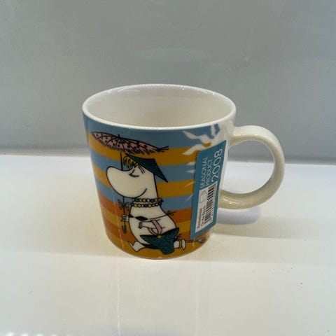 Muumimuki - Rantaelämää (kesäsesonki vuodelta 2008). Hyvä, tarraton ja vitriinissä säilytetty. Meillä ei kertaakaan käytetty🤗 Näitä olikin meillä kaksi🥹