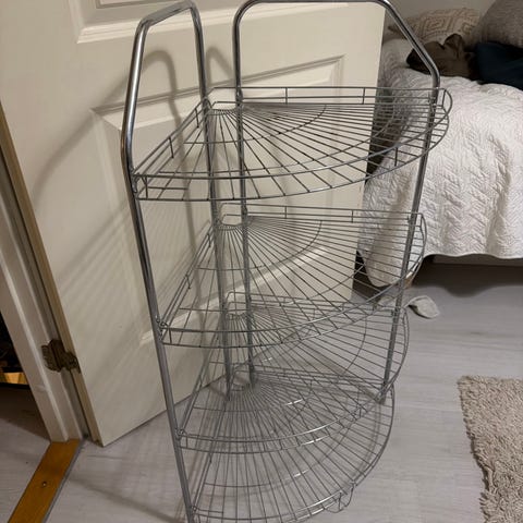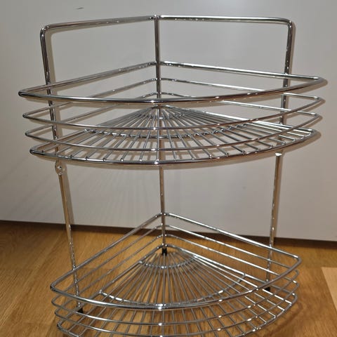 Metallinen kulmakori, väri musta, 2 kappaletta. Kolmiomaiset korit on suunniteltu kulmaan asennettaviksi ja niissä on ritilärakenne. Kummassakin korissa on kaksi pyöreää kiinnityslevyä, joilla korit voidaan kiinnittää seinään tai muuhun pystypintaan. Sopii esimerkiksi kylpyhuoneen, keittiön tai eteisen pientavaroiden säilytykseen.