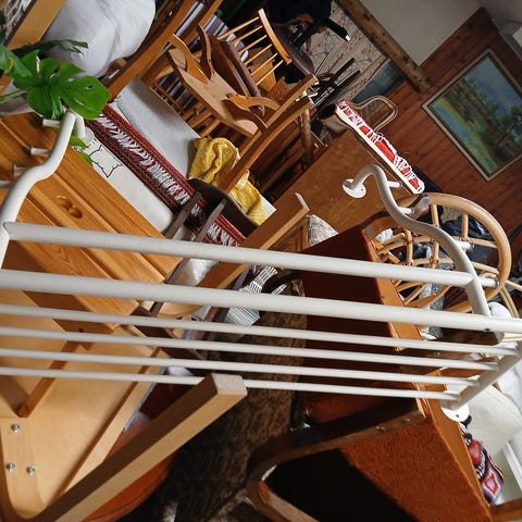 Uusi valkoiseksi maalattu naulakko, jossa hylly.