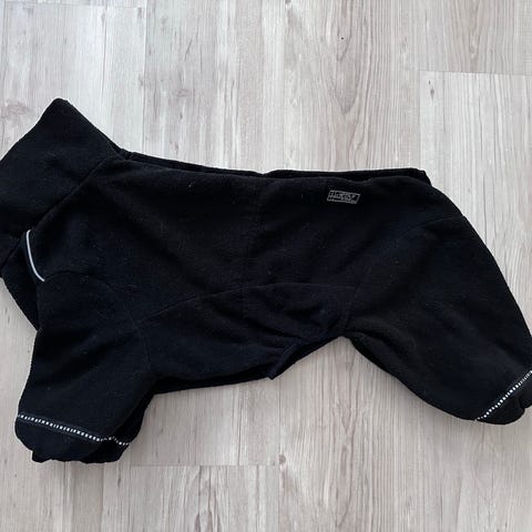 Musta koiran fleecehaalari. Niskassa neppari, selän mitalta tarrakiinnitys ja kaula-aukossa säädettävä kiristys. Lahkeensuissa heijastimet. Omaan käyttöön liian väljä.