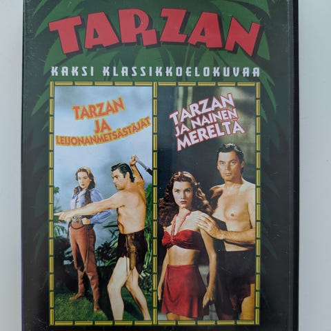 Tarzan kaksi klassikkoelokuvaa DVD. Sisältää elokuvat ”Tarzan ja amatsonit” sekä ”Tarzan ja leopardinainen”. Formaatti DVD, kotelo suomenkielisillä kansiteksteillä. (Tarzan and the Amazons ja Tarzan and the Leopard Woman)