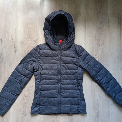 Myydään musta kevyttoppatakki irrotettavalla hupulla.