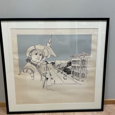Kehyksissä hieman kulumaa ja Passepartout ei ole valkoinen, mutta en osaa sanoa onko tummentunut vai ollut tuonvärinen jo kehystettäessä. Teos on lasin alla.