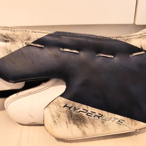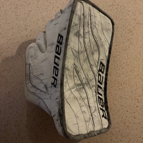 Bauer Supreme jääkiekkomaalivahdin kilpi. Väri pääosin valkoinen, mustia ja harmaita yksityiskohtia. Kilvessä säädettävät remmit ja suojattu kämmenselkä sekä sormialue, jotka on suunniteltu torjuntoihin jääkiekossa. Sopii käytettäväksi maalivahdin muun suojavarustuksen kanssa jääkiekkoharjoituksissa ja -peleissä.kilpi vasempaan käteen . Pesty jouluna ola sitten ja muutaman kerran pelattu höntsä kiekkoa.