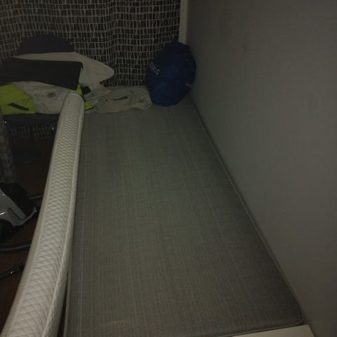 sänky. Valkoiset sängynpäädyt ja -laidat, suorakulmainen runko. Sopii yhden hengen sängyksi esimerkiksi makuuhuoneeseen tai lastenhuoneeseen. Patja ja ruudullinen lakana kuvissa havainnollistamassa kokoa ja käyttöä.